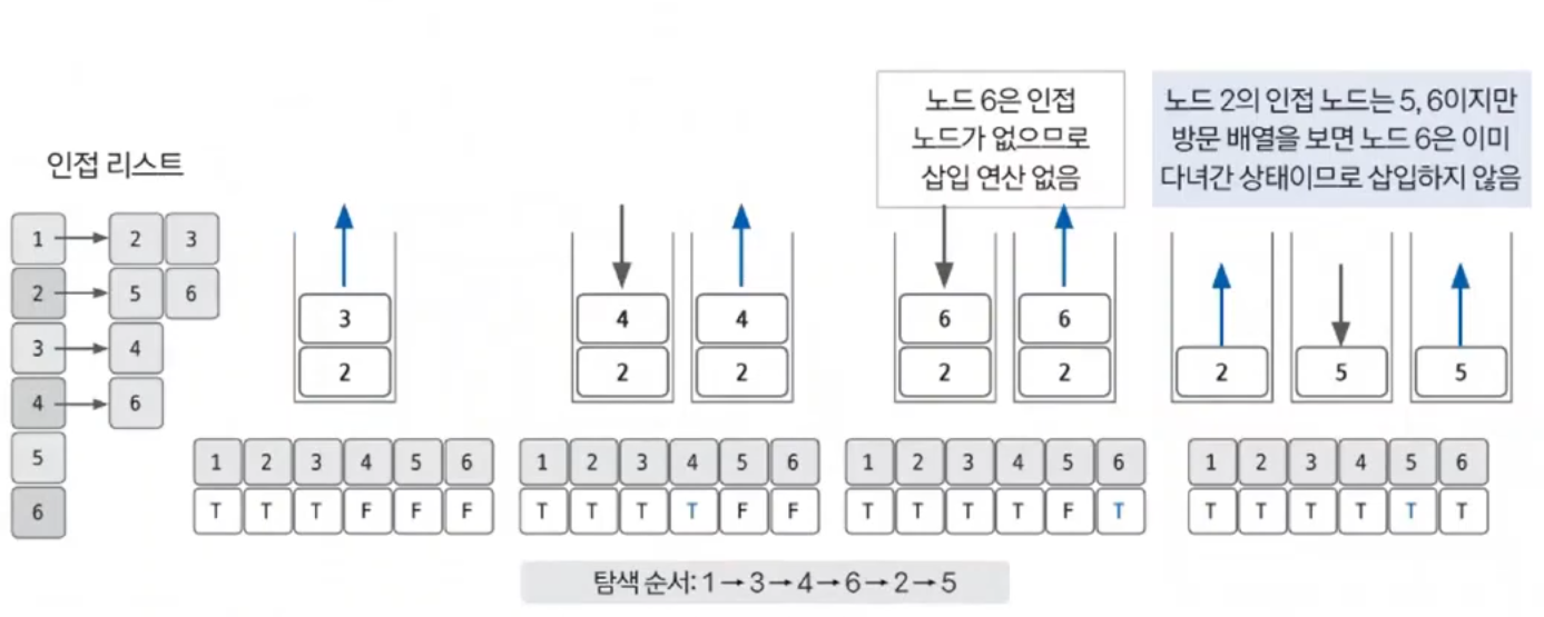 Tip) 스택에 노드를 삽입할 때 방문 배열을 체크하고, 스택에서 노드를 뺄 때 탐색 순서에 기록하며 인접 노드를 방문 배열과 대조한다.