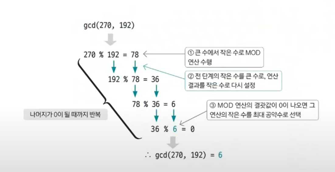유클리드 호제법을 수행하기 위해 MOD연산을 이해 해야 한다. MOD 연산이 최대 공약수를 구하는데 사용된다.