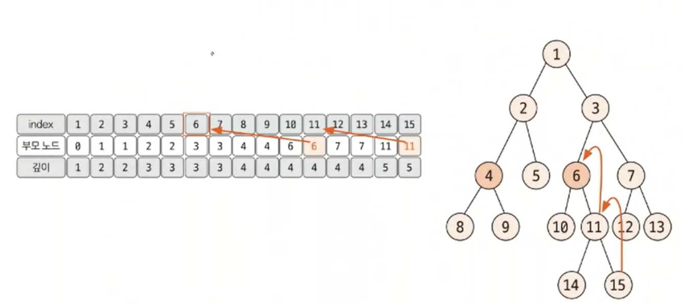 - 부모 노드 배열 P[K][N] = P[K - 1][P[K - 1][N]]