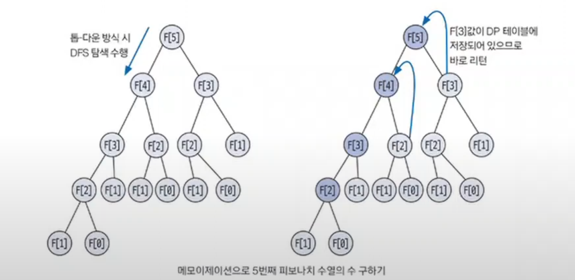 - 모든 작은 문제들은 한 번만 계산해 DP 테이블에 저장하며 추후 재사용할 때는 DP 테이블을 이용한다. 이를 메모이제이션(memoization) 기법이라고 부른다.