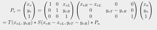 윈도우 내의 점 (Xw, Yw)이 윈도우 - 뷰포트 변환을 하여 뷰포트 내부의 점 (Xv, Yv)가 되었을때, 점 (Xv,Yv)는 이동변환과 신축변환을 이용하여 다음과 같이 구할 수 있다.